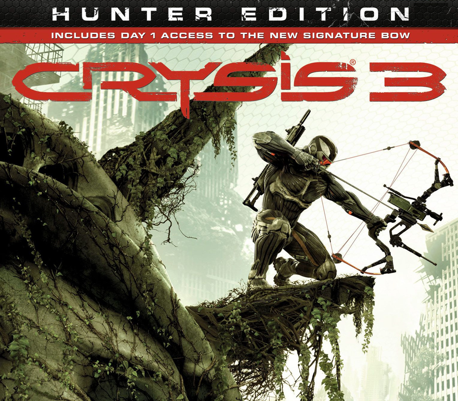 Hunter Edition ContentThe full Crysis 3 base game with early access to the new Predator Bow, bow skin, Recon Arrow and Hunter Nanosuit module for use in multiplayer, as well as a bonus XP boost up to Level 5 and three exclusive Hunter-themed dog tags. Game DetailsThe award-winning developer Crytek is back with Crysis 3, the first blockbuster shooter of 2013! Return to the fight as Prophet, the Nanosuit soldier on a quest to rediscover his humanity and exact brutal revenge. Adapt on the fly with the stealth and armor abilities of your unique Nanosuit as you battle through the seven wonders of New York’s Liberty Dome. Unleash the firepower of your all-new, high-tech bow and alien weaponry to hunt both human and alien enemies. Uncover the truth behind the death of your squad while reestablishing the power of human will in a rich story full of exciting twists and turns. Crysis 3 is the ultimate sandbox shooter, realized in the stunning visuals only Crytek and the latest version of CryENGINE can deliver. Assess, Adapt, and Attack starting spring 2013. Features Seven Wonders of the Urban Rainforest – New York City has been contained in a giant nanodome and grown into a unique rainforest with seven distinct environments. Master the ultimate sandbox and turn it into your own personal hunting ground. Assess, Adapt, and Attack – Crysis’s highly-acclaimed sandbox gameplay is back with more open levels to let players choose their path and approach. Your upgraded Nanosuit allows brute force or stealth, always giving you more than one option. Expanded Multiplayer – Experiment with new ways to customize your Nanosuit and brand new game modes. The Biggest and Most Explosive Arsenal in Franchise History – In addition to giving you an arsenal of human firearms, Crysis 3 lets you scavenge alien weapons and deploy an all-new signature bow The Evolution of CryENGINE – CryENGINE unleashes the power of the Crytek creative team and delivers a visually stunning and varied gameplay experience.
